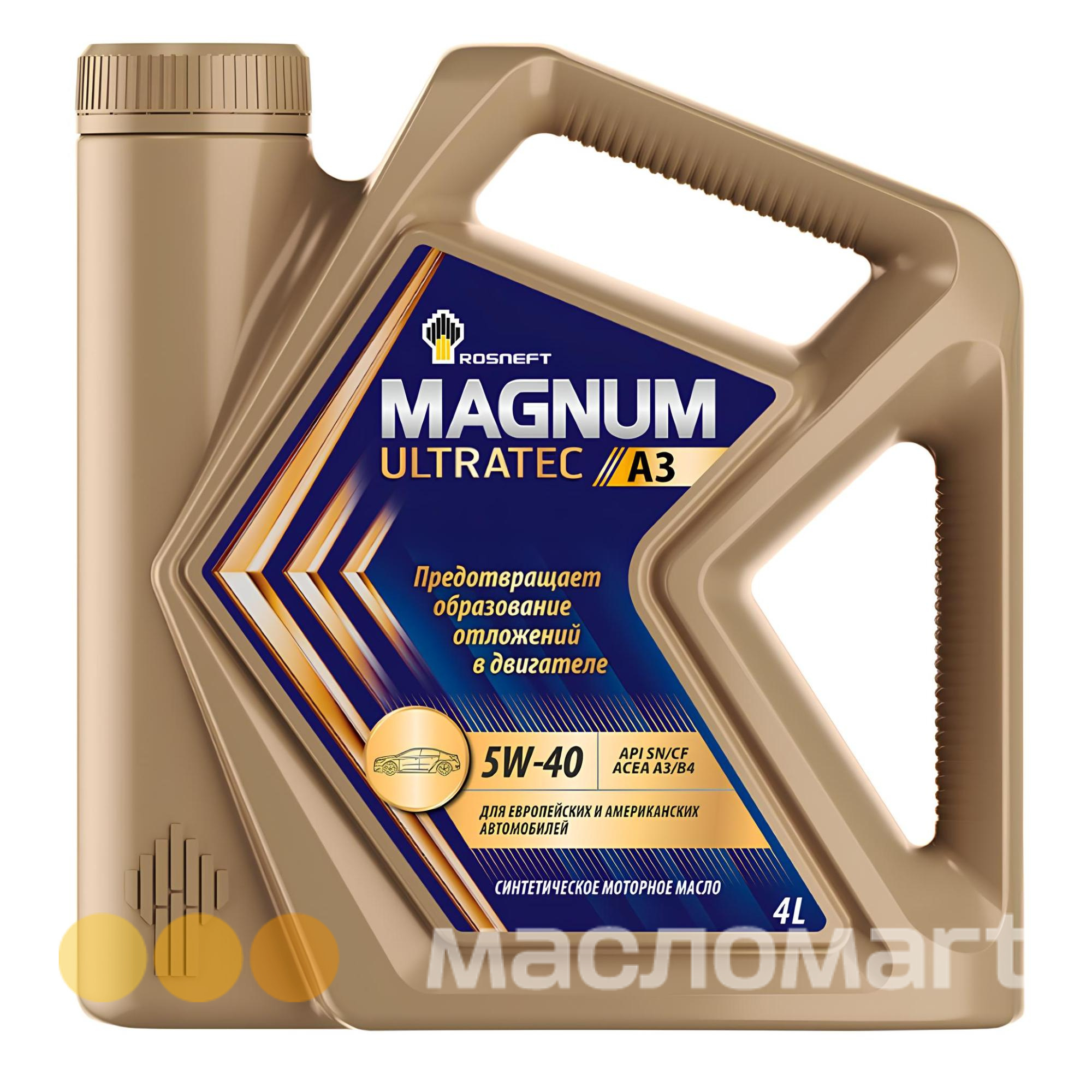 Моторное масло Rosneft Magnum Ultratec A3 5W-40 предназначено для применения в современных бензиновых и дизельных двигателях легковых автомобилей и лёгкой коммерческой техники, в том числе оборудованных турбонаддувом, где необходимо применение масел, соответствующих требованиям API SN/CF, АСЕА А3/В4, А3/В3 или одной из указанных ниже ОЕМ-спецификаций.