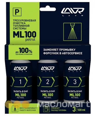 ML100 – набор из трех составов для очистки топливной системы бензиновых двигателей на основе запатентованного пакета моющих присадок LAVR ISP / DET™. Состав №1 удаляет рыхлые загрязнения и нагары на клапанах и форсунках. Состав №2 выводит лаковые и смолистые отложения из топливной системы. Состав №3 смазывает, защищает от коррозии и появления новых загрязнений. Процедура равноценна промывке форсунок в автосервисе и удаляет до 100% загрязнений. При регулярном применении улучшаются показатели приемистости и экономичности, стабилизируется компрессия в цилиндрах. ML100 подходит для всех типов систем впрыска.